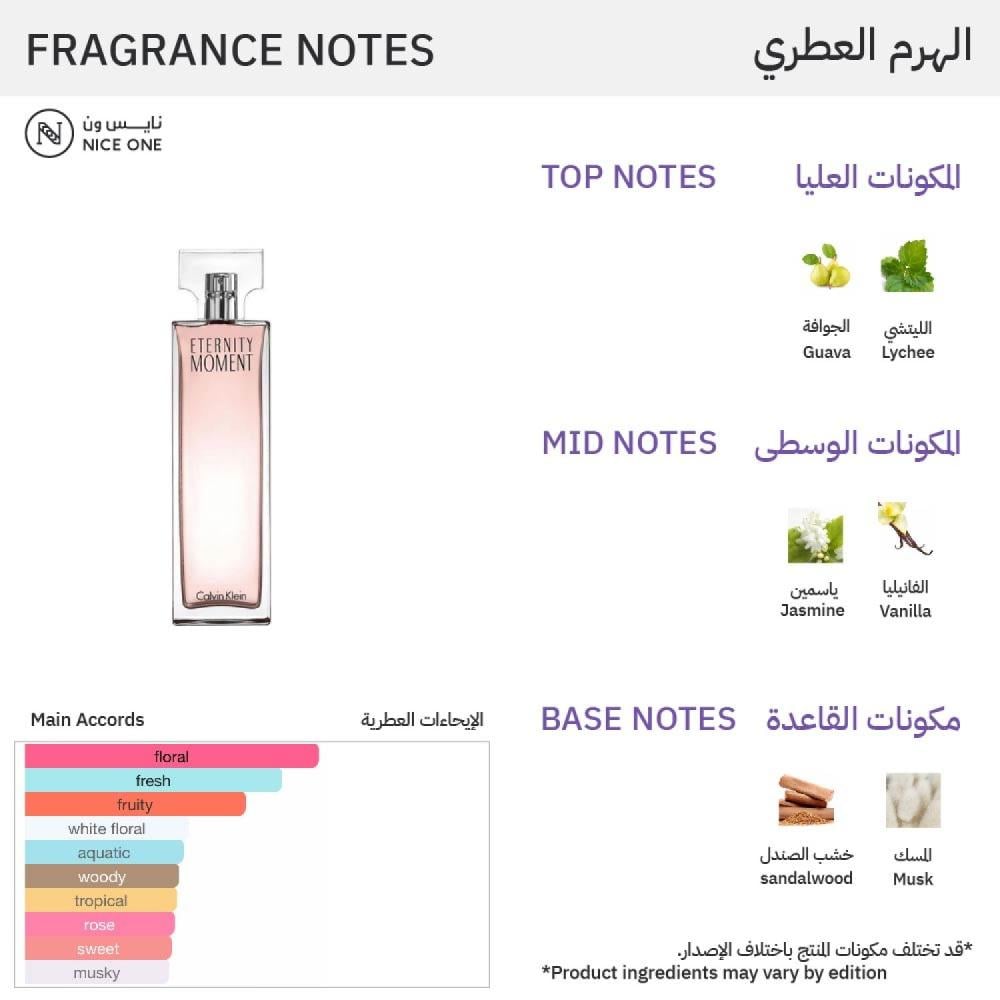 Eternity Moment by Calvin Klein is a feminine, romantic fragrance that reflects moments of beauty and freshness. It combines floral and delicious fruity notes to give you a sophisticated presence that lasts all day long.